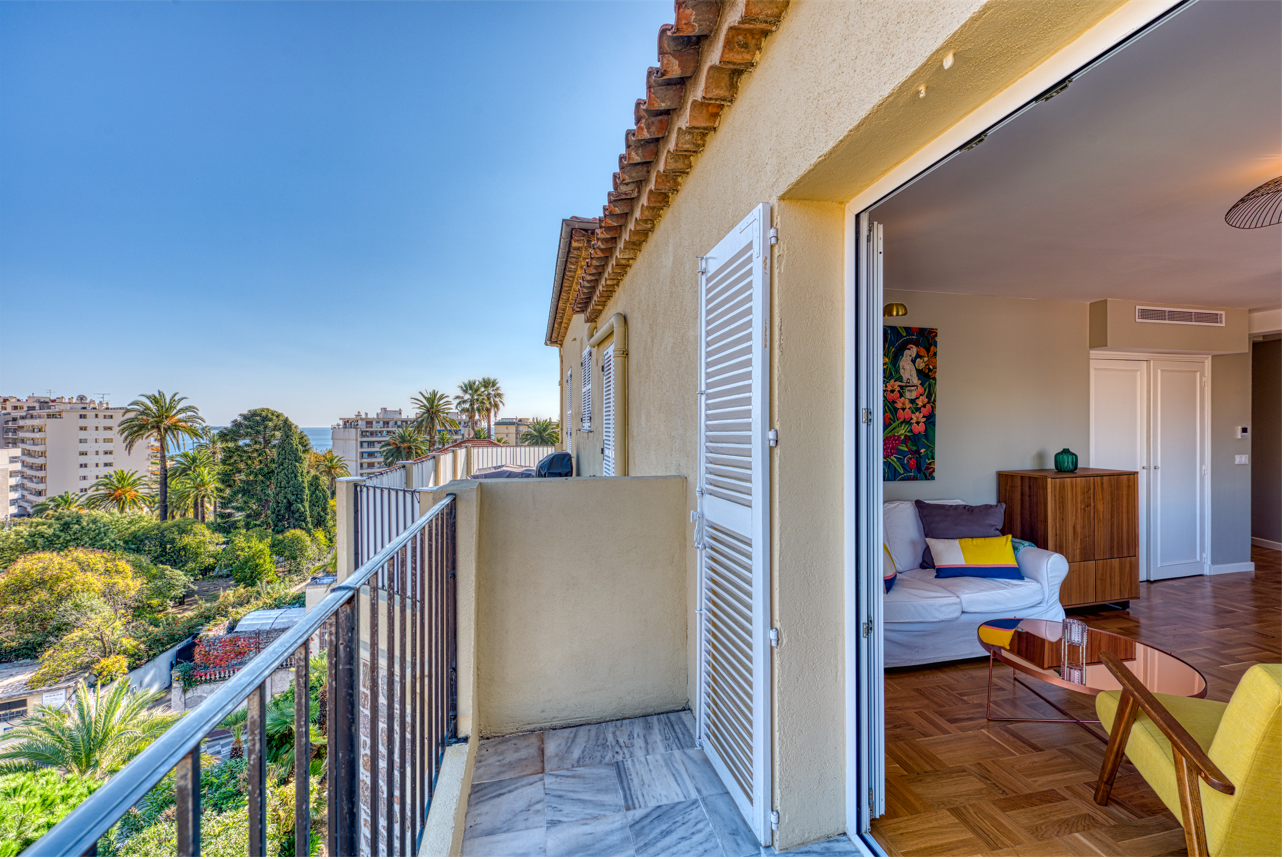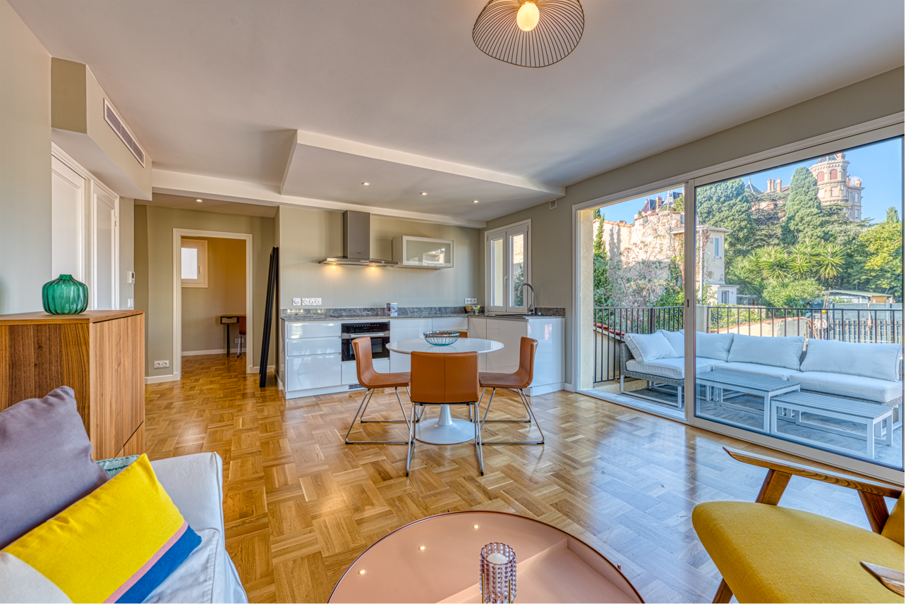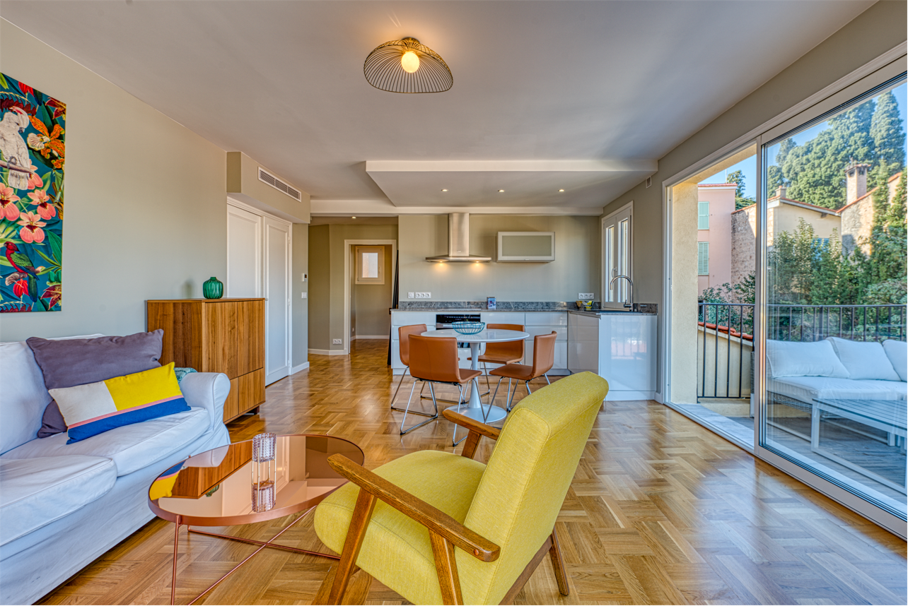 This delightful two-bedroom apartment of approximately 53 m², on the second and last floor, has been completely renovated in a Scandinavian style and with quality materials, and is located in an old 19th century building called "Villa Albert", close to the Suquet, the historic old town in Cannes. The access to the villa is through a beautiful stone staircase and the apartment consists of a living area with oak parquet flooring and an equipped open-plan kitchen with high quality appliances, the living room with access to a marble balcony with views over the heights of the Suquet and the sea, as well as to a marble terrace, and a master bedroom with marble shower room, toilet and laundry. In the basement there is a cellar. This luxury residence, with Bourgeois charm, overlooks the street, offers contemporary amenities such as hidden central climate control, intelligent housing system, and is close to all conveniences, 15 minutes’ walk from the Palais des Festivals, the town center and 800 meters from the beaches.tes’ walk from the Palais des Festivals, the town center and 800 meters from the beaches.