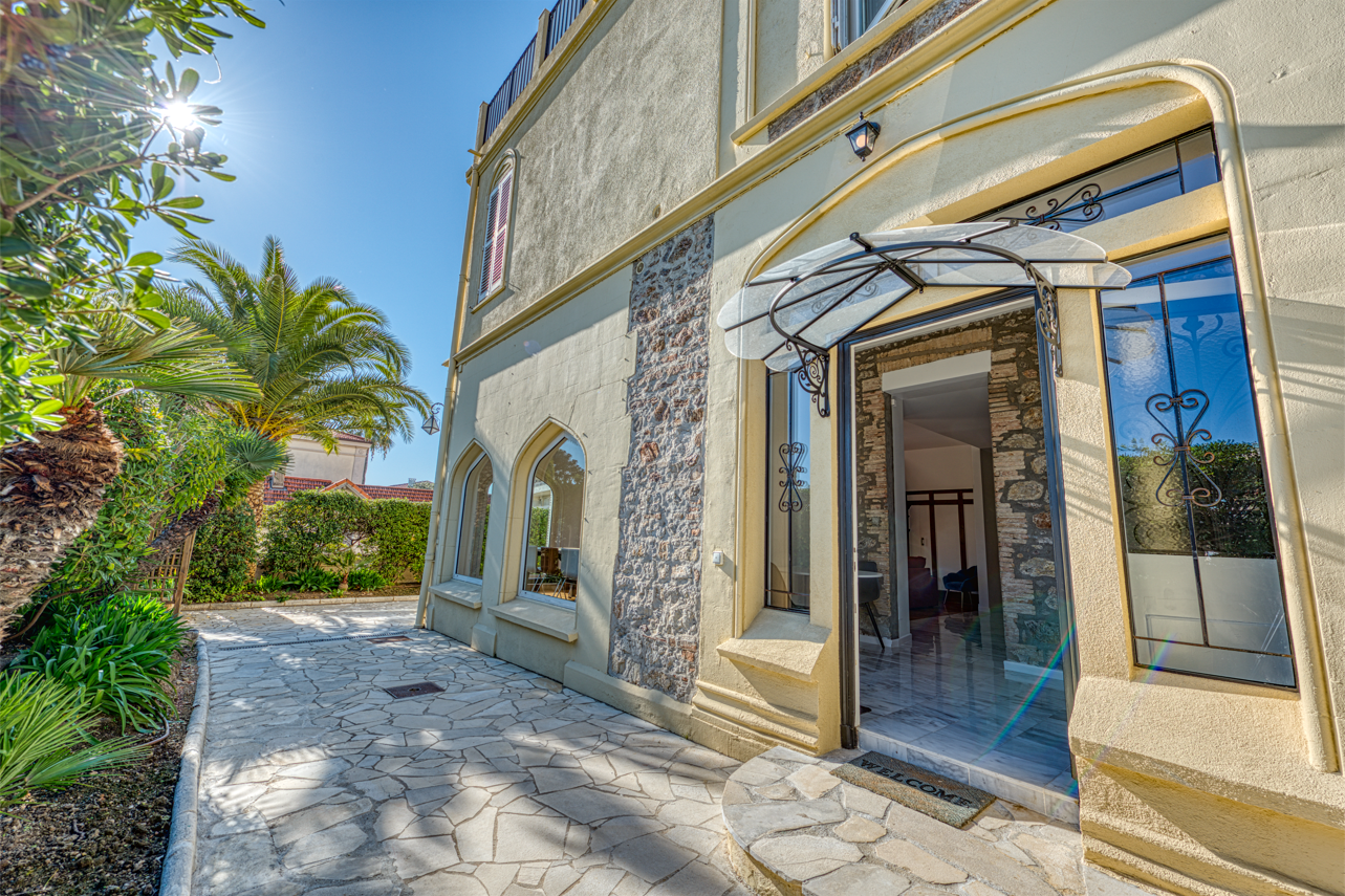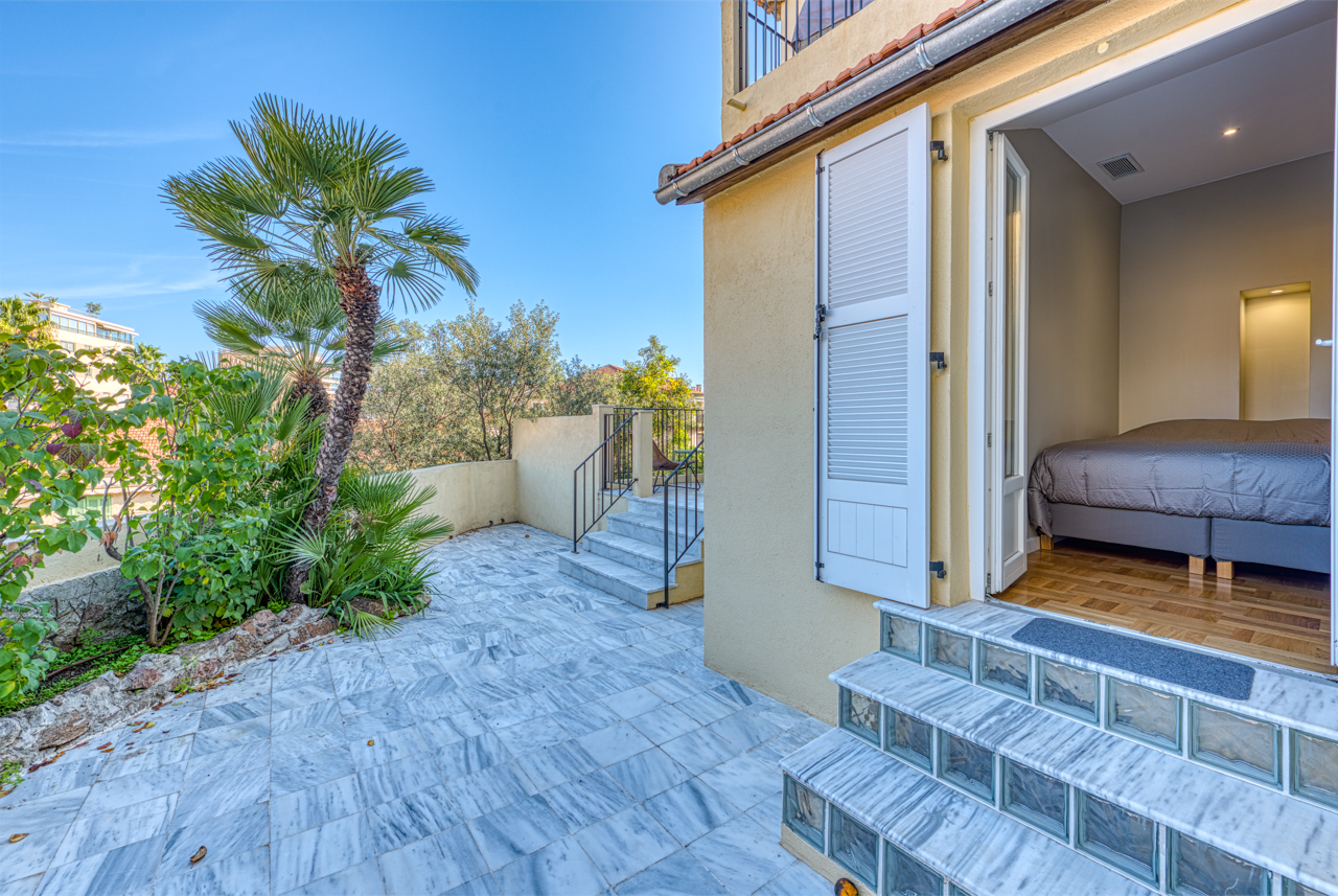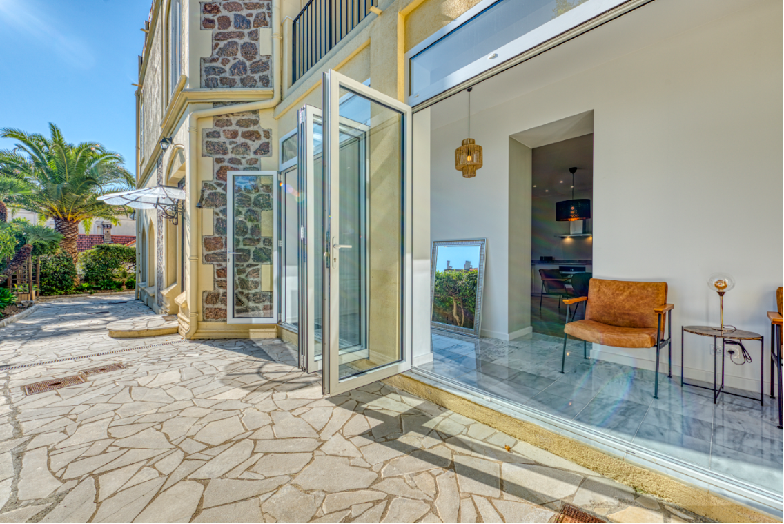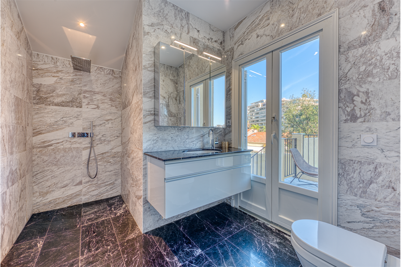 This delightful three-bedroom apartment of approximately 77 m², on the first floor out of two, has been completely renovated in a Scandinavian style and with quality materials, and is in an old 19th century building called "Villa Albert", close to the Suquet, the historic old town in Cannes. The access to the villa is through a beautiful stone staircase and this atypical apartment consists of a living room with wooden floor and fireplace, opening on to a beautiful marble terrace on two levels, with view over the Suquet and barbecue area, an equipped open-plan kitchen with high quality appliances from MIELE, a master bedroom with shower room and marble toilet, a second bedroom with access to a terrace surrounded with green bushes and finally a marble shower room with toilet. In the basement there is a cellar. This luxury residence, with Bourgeois charm, overlooks the street, offers contemporary amenities such as hidden central climate control, intelligent housing system, and is close to all conveniences, 15 minutes’ walk from the Palais des Festivals, the town center and 800 meters from the beaches.