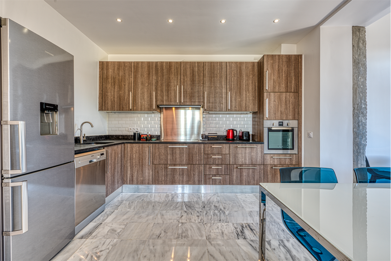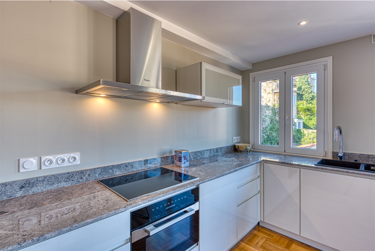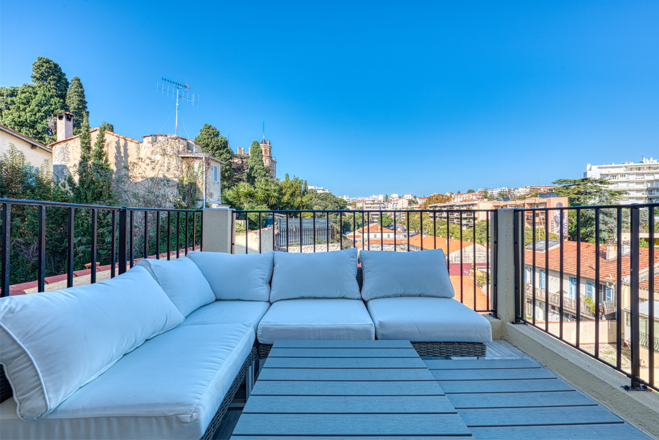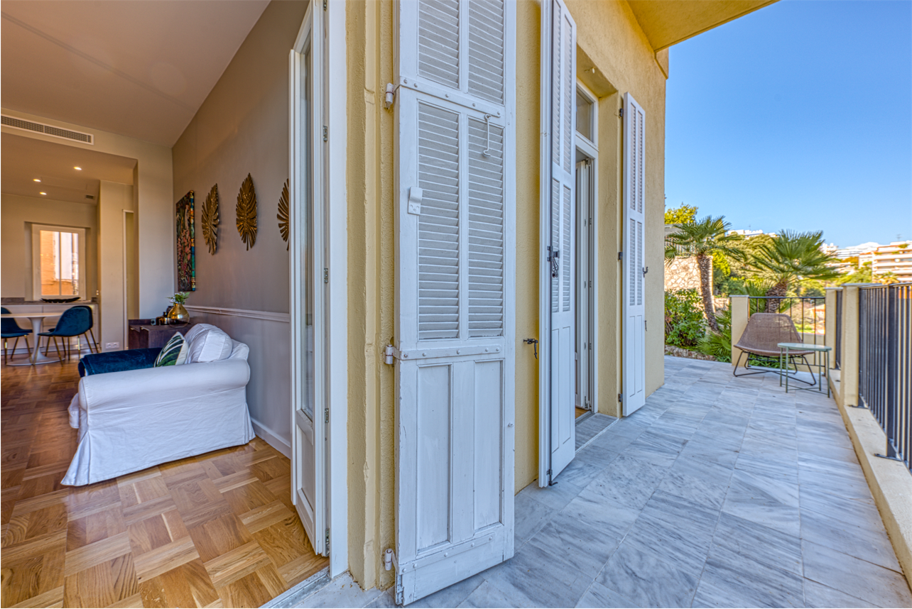 This delightful three-bedroom apartment of approximately 77 m², on the first floor out of two, has been completely renovated in a Scandinavian style and with quality materials, and is in an old 19th century building called "Villa Albert", close to the Suquet, the historic old town in Cannes. The access to the villa is through a beautiful stone staircase and this atypical apartment consists of a living room with wooden floor and fireplace, opening on to a beautiful marble terrace on two levels, with view over the Suquet and barbecue area, an equipped open-plan kitchen with high quality appliances from MIELE, a master bedroom with shower room and marble toilet, a second bedroom with access to a terrace surrounded with green bushes and finally a marble shower room with toilet. In the basement there is a cellar. This luxury residence, with Bourgeois charm, overlooks the street, offers contemporary amenities such as hidden central climate control, intelligent housing system, and is close to all conveniences, 15 minutes’ walk from the Palais des Festivals, the town center and 800 meters from the beaches.