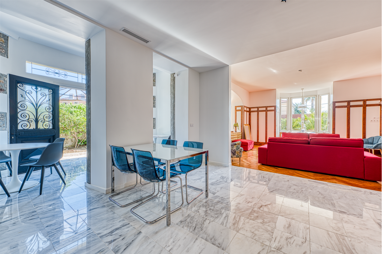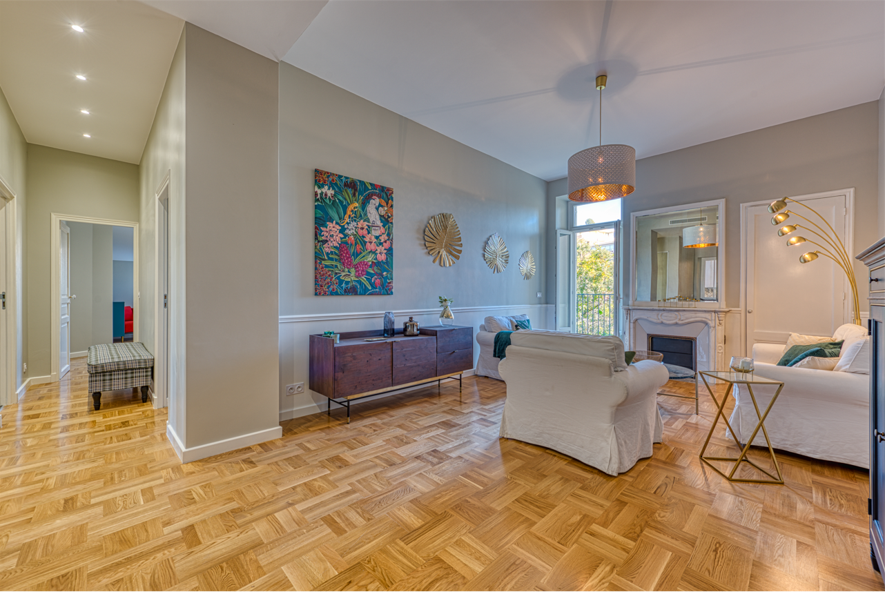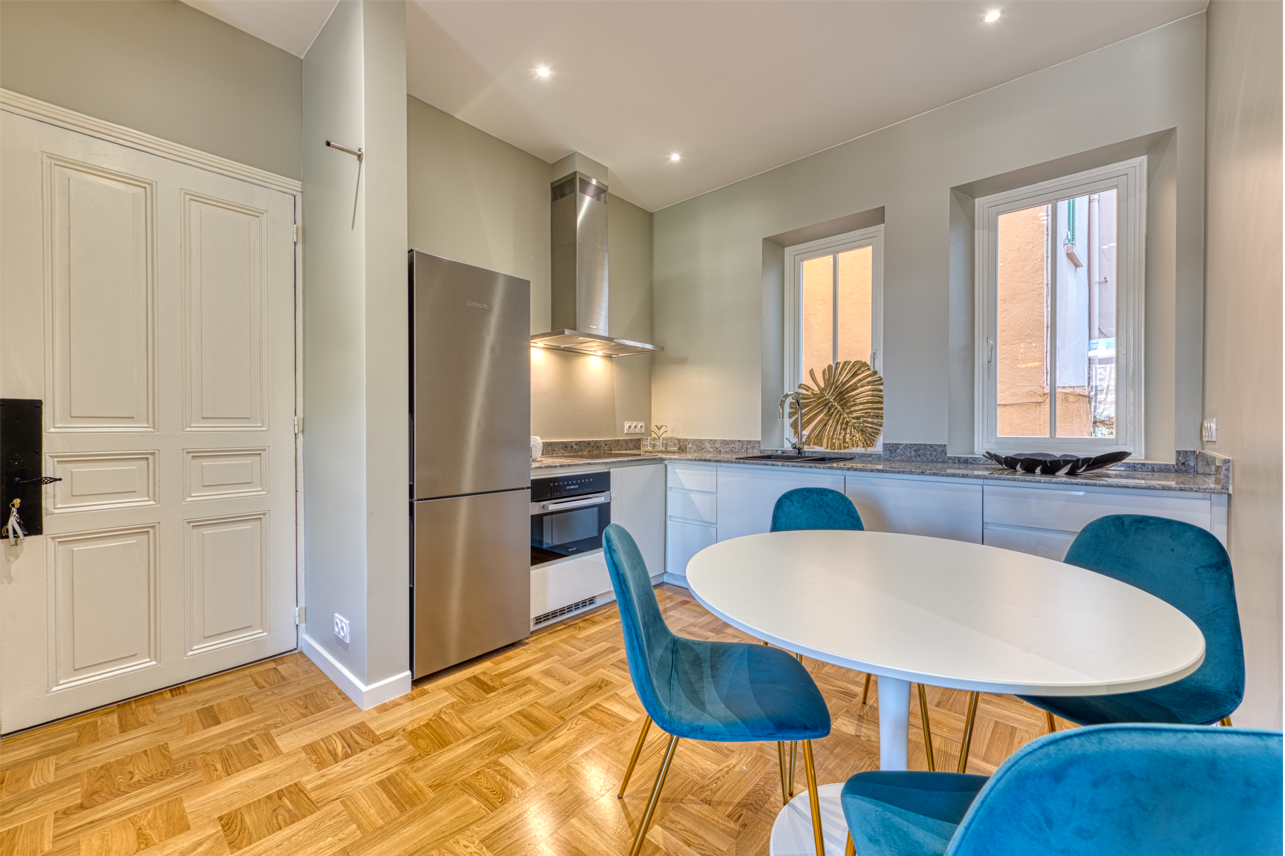 This delightful two-bedroom apartment of approximately 95 m², has been completely renovated in a Scandinavian style and with quality materials, and is in an old 19th century building called "Villa Albert", close to the Suquet, the historic old town in Cannes. The access to the villa is through a beautiful stone staircase and the apartment consists of an entrance hall, a living room with open-plan kitchen, equipped with high quality appliances, a second living room with wooden floor, fireplace, bow window and access to a charming dining area, a master bedroom with shower room and marble toilet. In the basement there is a cellar. This luxury residence, with Bourgeois charm, overlooks the street, offers contemporary amenities such as hidden central climate control, intelligent housing system, and is close to all conveniences, 15 minutes’ walk from the Palais des Festivals, the town center and 800 meters from the beaches.