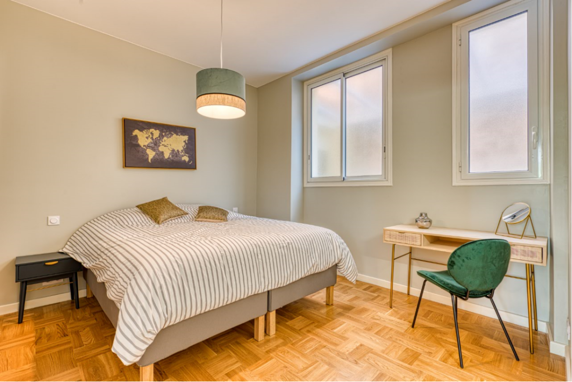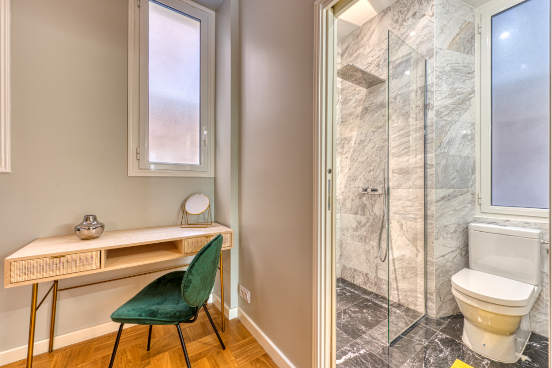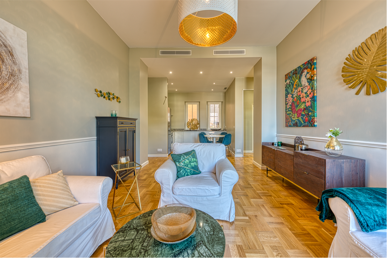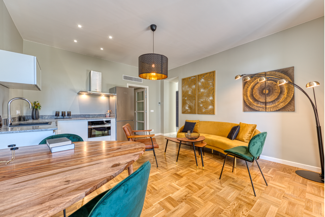 This delightful two-bedroom apartment of approximately 95 m², has been completely renovated in a Scandinavian style and with quality materials, and is in an old 19th century building called "Villa Albert", close to the Suquet, the historic old town in Cannes. The access to the villa is through a beautiful stone staircase and the apartment consists of an entrance hall, a living room with open-plan kitchen, equipped with high quality appliances, a second living room with wooden floor, fireplace, bow window and access to a charming dining area, a master bedroom with shower room and marble toilet. In the basement there is a cellar. This luxury residence, with Bourgeois charm, overlooks the street, offers contemporary amenities such as hidden central climate control, intelligent housing system, and is close to all conveniences, 15 minutes’ walk from the Palais des Festivals, the town center and 800 meters from the beaches.