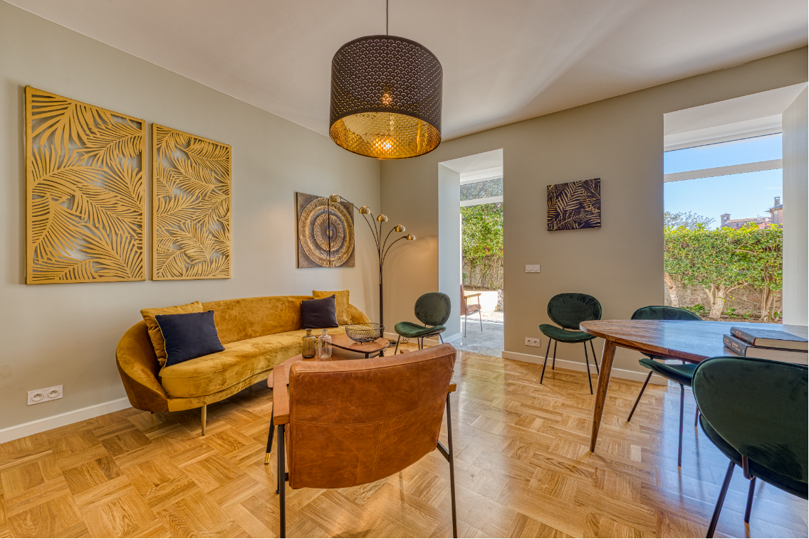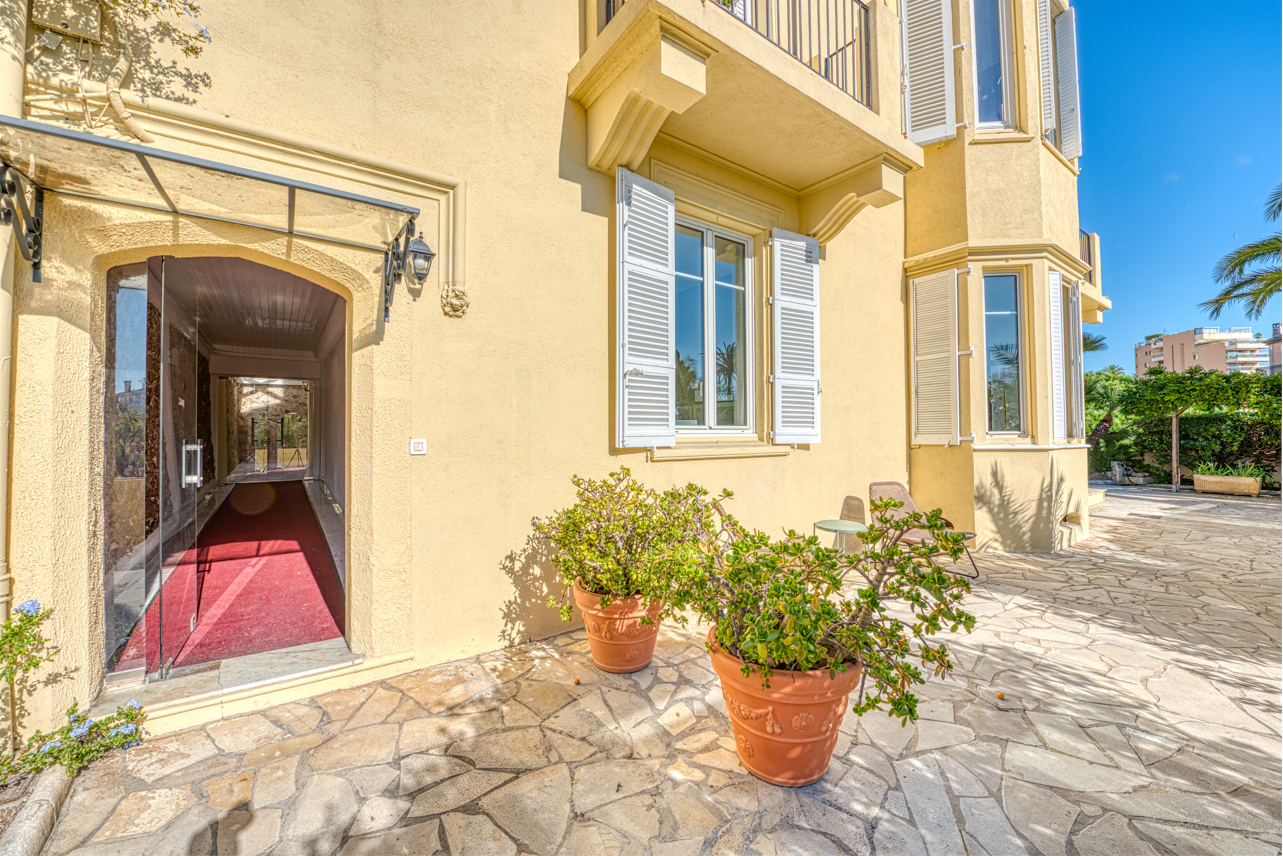 This delightful ground floor apartment of approximately 70 m², has been completely renovated in a Scandinavian style and with quality materials, and is in an old 19th century building called "Villa Albert", close to the Suquet, the historic old town in Cannes. Access to the apartment is through a surprising private winter garden and the apartment consists of: a large entrance hall, a living room with oak parquet flooring and open-plan kitchen, with high quality appliances for example from MIELE, opening on to a very beautiful veranda of more than 8 m², as well as on to a fully tiled courtyard surrounded with green bushes, a master bedroom with a shower room and marble toilet and finally a second marble bathroom, with bath, Italian shower and toilet, a kind of “alcove” with SPA atmosphere. In the basement there is a cellar. This luxury residence, with Bourgeois charm, overlooks the street, offers contemporary amenities such as hidden central climate control, intelligent housing system, and is close to all conveniences, 15 minutes’ walk from the Palais des Festivals, the town center and 800 meters from the beaches.